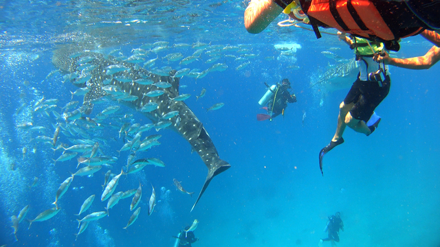 オスロブで出会えるジンベイザメは、体長10メートルを超える大型の個体も多く、その迫力は圧倒的です。水中で目の前に現れた瞬間、その巨大さに思わず息を飲むことでしょう。ジンベイザメは優雅にゆっくりと泳ぐため、一緒に並んで泳いだり、間近で観察したりすることができます。特に口を大きく開けて餌を食べる姿は圧巻で、直径1メートル以上もある口の中まで見ることができます。体表の白い斑点模様は個体ごとに異なり、まるで星空のような美しさです。手を伸ばせば触れられそうな距離まで近づくことができますが、ジンベイザメの保護のため接触は禁止されています。それでも、巨大な生き物と同じ海を泳ぐという体験は、言葉では表現できないほどの感動をもたらしてくれます。