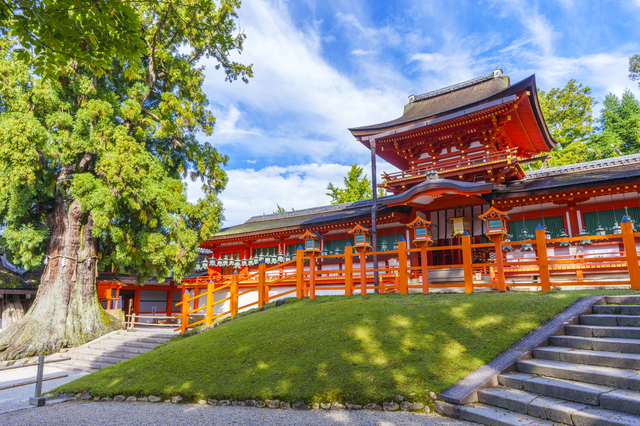 東大寺から歩いて約15分、鹿が自由に歩き回る奈良公園を抜けた先に鎮座するのが春日大社です。768年に創建されたこの神社は、世界遺産「古都奈良の文化財」の構成資産のひとつ。朱塗りの社殿が深い緑の原始林に包まれた光景は、他の神社では味わえない独特の神秘性を放っています。参道には約2,000基の石燈籠が並び、社殿周辺には約1,000基の釣燈籠が吊り下げられています。2月と8月に行われる万燈籠の神事では、すべての燈籠に火が灯され、幻想的な光景が広がります。宝物殿には国宝・重要文化財が多数収蔵されており、歴史好きにはたまらない空間です。境内は無料で散策できますが、御本殿エリアは有料なのでぜひあわせて参拝を。
