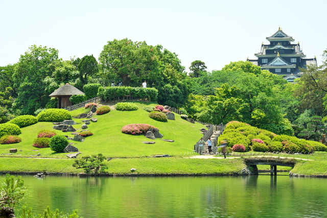 岡山観光のハイライトといえば、後楽園です。水戸偕楽園・金沢兼六園とならぶ日本三名園のひとつで、岡山藩主・池田綱政が元禄時代に築造した大名庭園です。広大な芝生広場・流店・唯心山・沢の池など、変化に富んだ景観が広がり、散策するごとに異なる表情を見せてくれます。春の桜・夏の蓮・秋の紅葉・冬の雪景色と四季折々の美しさが楽しめますが、特に春の桜の季節は後楽園全体が華やかな雰囲気に包まれます。鶴鳴館では抹茶の一服サービスがあり、庭を眺めながら優雅なひとときを過ごせます。後楽園の内側からは岡山城の天守閣も望むことができ、庭園と城がコラボした独特の景観は岡山観光の象徴的な風景です。岡山城で漆黒の天守が美しい「烏城」の歴史と展望を楽しむ