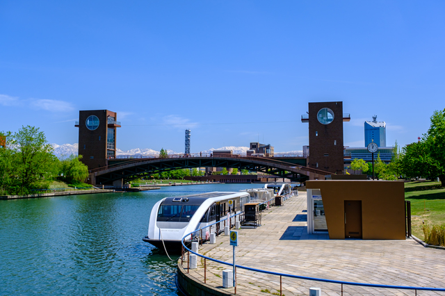 富山観光のスタートは富岩運河環水公園から。富山駅北口からすぐの場所にあるこの公園は、運河を利用した美しい水辺の景観が広がる富山市民の憩いの場所です。公園内にある「世界一美しいスターバックス」と称されたスターバックスコーヒーは、ガラス張りの外観と水辺の景色が相まって特別な雰囲気を醸し出しています。公園内には噴水や遊歩道が整備されており、天気の良い日は立山連峰を背景に美しい景色が楽しめます。運河を巡る観光船も運航されており、水上から富山の街並みと自然を眺めるクルーズも人気。富山観光の最初に訪れたい開放的なスポットです。富山城址公園で富山の歴史と文化に触れる