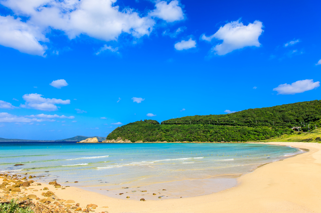 五島列島観光2日目は、高浜海水浴場を訪れましょう。環境省の快水浴場百選にも選ばれた高浜海水浴場は、透明度抜群のエメラルドグリーンの海と白い砂浜が広がる、日本屈指の美しいビーチです。石垣島や沖縄と比べても遜色ない透明度の高さで、晴れた日には海底まで透けて見えるほど。シュノーケリングや海水浴を楽しむのはもちろん、ただ波音を聞きながら白砂のビーチに座っているだけでも至福の時間が過ごせます。観光客がまだ少なく、手つかずの自然が残るビーチとして、知る人ぞ知る隠れ名所でもあります。五島列島に来たら必ず訪れたい絶景スポットです。