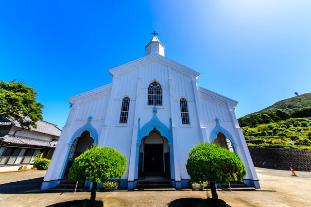 堂崎天主堂に続いて、五島列島の教会群を巡りましょう。白壁と青い屋根が印象的な水ノ浦教会は、丘の上に立つ美しい教会で、眼下に広がる五島の海との対比が絶景です。旧五輪教会は国の重要文化財に指定された木造の教会で、細部まで丁寧に作られた内部装飾が美しく、明治時代の宗教建築の価値を今に伝えています。五島列島には29もの教会が点在しており、それぞれ異なる建築様式と歴史を持つ個性豊かな教会巡りが五島観光の醍醐味のひとつ。静かな集落の中に佇む教会は、訪れる人の心に深い静寂と感動をもたらします。