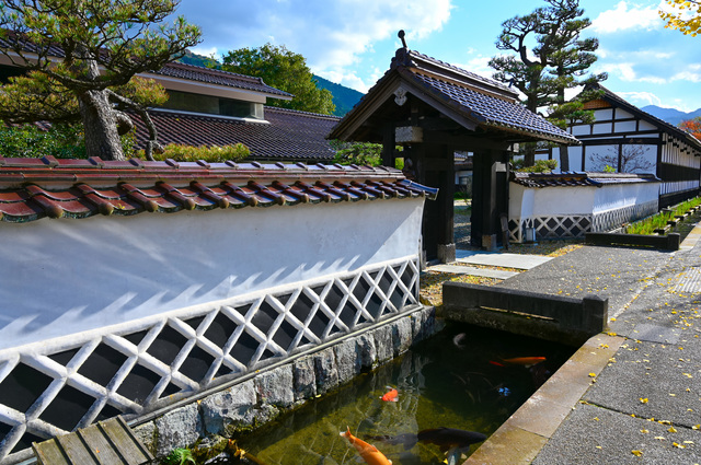 津和野の掘割で鯉の泳ぐ街並みを散策する