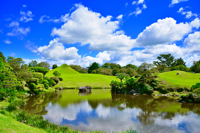 熊本市内にある回遊式庭園で、阿蘇の伏流水を利用した池を中心に東海道五十三次の景勝を模した庭園が広がります。熊本藩主・細川氏ゆかりの名園として国の特別史跡・名勝に指定されています。隣接する出水神社では細川氏を祀っており、歴史の重みを感じられます。