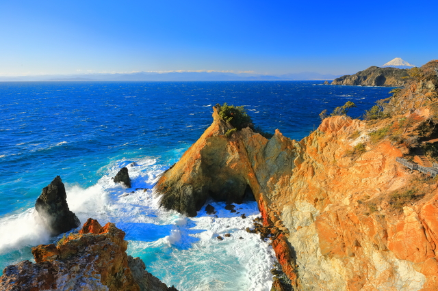 松崎町観光の後は、黄金崎へ向かいましょう。夕日が当たると黄金色に輝くことから名付けられた黄金崎は、西伊豆を代表する絶景スポットのひとつです。馬の形に似た岩「馬の背」が海に突き出した独特の地形と、駿河湾越しに望む富士山の絶景は圧巻。特に夕方には黄金色に染まる岩と夕日と富士山が織り成す絶景が楽しめ、西伊豆屈指のフォトスポットとして多くのカメラマンが訪れます。帰路の前に立ち寄るスポットとして、西伊豆観光の締めくくりに黄金崎の絶景を堪能しましょう。