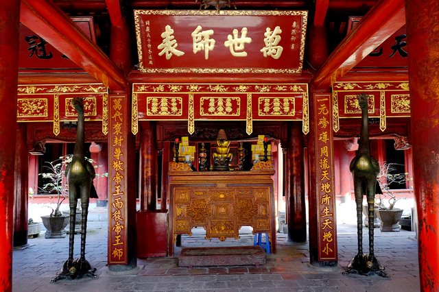 ホーチミン廟の後は、文廟(ヴァン・ミエウ)へ向かいましょう。1070年に建立されたハノイ最古の大学跡であり、孔子を祀る廟としてベトナムの学問の聖地として知られています。境内には科挙合格者の名前を刻んだ亀碑が82基並んでおり、試験前に訪れると合格のご利益があるとされるパワースポットとしても有名。緑豊かな庭園と歴史的な建物が調和した美しい空間は、ハノイ観光の定番スポットとして多くの観光客が訪れます。ハノイ観光の締めくくりとして、文廟でベトナムの学問の歴史に思いを馳せてみてください。