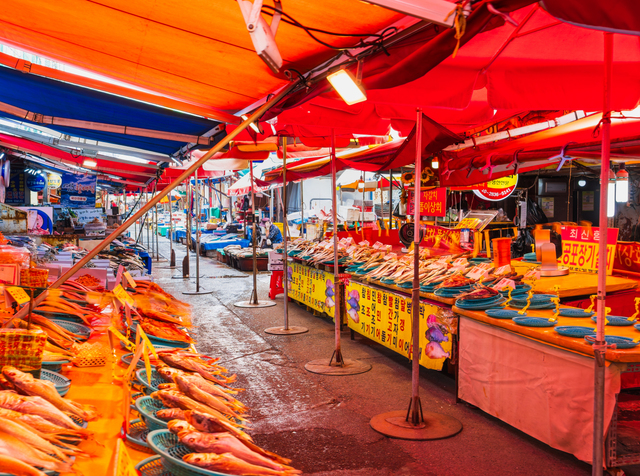 龍頭山公園を楽しんだ後は、徒歩で約15分のチャガルチ市場へ向かいましょう。韓国最大級の水産市場として知られるチャガルチ市場は、釜山観光で外せないグルメスポットです。1階には新鮮な魚介類がずらりと並び、その場でお刺身を注文して2階の食堂で食べるスタイルが人気。活きたアワビやウニ、ヒラメの刺身など、日本では考えられないほどリーズナブルな価格で極上の海鮮を堪能できます。市場のおばちゃんたちとの値段交渉も旅の醍醐味のひとつ。周辺には国際市場や富平カントン市場など活気ある市場が密集しているので、あわせて散策するのもおすすめです。この釜山モデルコースでは、ここでランチタイムを過ごす想定で約1時間〜1時間半を確保しています。