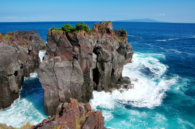午後は伊東を代表する景勝地、城ヶ崎海岸へ足を延ばしましょう。伊東駅から伊豆急行で約15分の伊豆高原駅からバスまたは徒歩でアクセスできます。約4,000年前の大室山の噴火による溶岩が海に流れ込み、波の浸食によって形成されたダイナミックなリアス海岸は、まさに自然が生んだ芸術作品。中でも門脇つり橋は全長48メートル、高さ約23メートルの吊り橋で、眼下に広がる断崖絶壁と打ち寄せる白波のスリルと絶景を同時に楽しめる伊東観光屈指のスポットです。橋を渡った先の門脇灯台からは、伊東の海岸線を一望する大パノラマが広がり、天気の良い日には伊豆大島まで見渡せます。遊歩道沿いには四季折々の花も咲き、自然散策としても最高の時間を過ごせます。