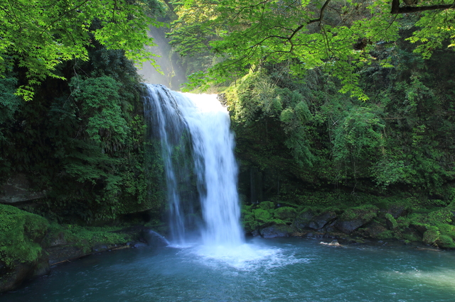高塚愛宕地蔵尊から車で約10分、次に向かうのは慈恩の滝(じおんのたき)です。日田市天瀬町と玖珠町の境に位置するこの滝は、上段と下段の二段構えで落差約30メートルの迫力ある姿を見せてくれます。最大の見どころは、滝の裏側に遊歩道が整備されており、滝を裏側からくぐり抜けるように歩けること。轟音とともに降り注ぐ水しぶきを間近に感じる体験は、まさにスリル満点です。「裏見の滝」とも呼ばれ、別名「裏見の滝巡り」として日田・天瀬エリアの人気スポットになっています。滝の周囲はマイナスイオンに満ちており、夏でもひんやりとした空気が心地よく感じられます。国道沿いにありアクセスしやすいのも嬉しいポイント。駐車場から滝までは徒歩すぐなので、ドライブの途中に気軽に立ち寄れる日田の名瀑です。