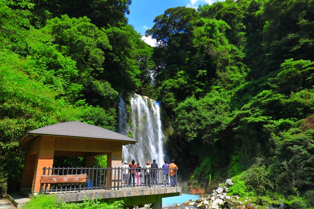 午後は霧島温泉郷の中心地・丸尾エリアへ移動し、丸尾滝を見学しましょう。丸尾滝は高さ約23メートル、幅約16メートルの豪快な滝で、最大の特徴は温泉水が流れ落ちるという珍しさにあります。上流の温泉水や湧水が集まって形成されているため、寒い季節には滝から湯気が立ち上る幻想的な光景を見ることができます。国道223号線沿いにあるためアクセスも良く、車を停めてすぐに滝を眺められるのも嬉しいポイントです。秋の紅葉シーズンには周囲の木々が色づき、滝との共演は息をのむ美しさです。夜にはライトアップされることもあり、昼間とはまた違った表情を楽しめます。霧島温泉の恵みを目で感じられる、霧島ならではの名瀑です。