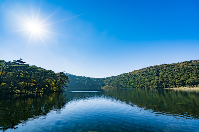 2日目の朝は、霧島連山の西側に広がるえびの高原へ向かいましょう。標高約1,200メートルに位置するえびの高原は、韓国岳や甑岳に囲まれた美しい高原地帯です。ススキの穂が黄金色に輝く秋の風景が「えびの」の名の由来とも言われています。ここでは池めぐり自然探勝路を歩くのがおすすめです。不動池、六観音御池、白紫池の3つの火口湖を約2時間で巡るコースで、コバルトブルーやエメラルドグリーンに輝く神秘的な湖面に心を奪われます。遊歩道は比較的整備されているため、トレッキング初心者でも安心して歩けます。野鳥のさえずりを聴きながら、霧島の原生林の中を気持ちよく散策してください。