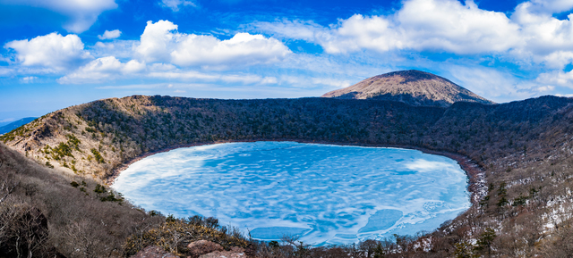 えびの高原を堪能したら、霧島を代表する絶景スポット大浪池を訪れましょう。大浪池は標高1,239メートルに位置する周囲約1.9キロメートルの火口湖で、日本で最も高い場所にある山頂火口湖として知られています。登山口から山道を約40分ほど登ると、目の前にコバルトブルーの湖面が広がる感動的な景色が待っています。火山活動によって生まれたほぼ円形の湖は、天候や季節によってブルーからグリーンへと色を変え、その美しさは何度訪れても新鮮な驚きを与えてくれます。お鉢めぐりと呼ばれる周回コースを歩けば、さまざまな角度から大浪池と霧島連山の絶景を楽しめます。霧島の大自然のスケールを全身で感じられる必訪スポットです。