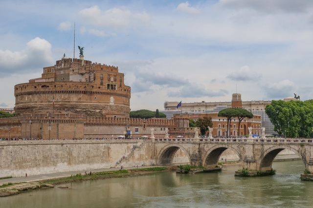 バチカン美術館を出たら、徒歩約10分でカトリックの総本山であるサン・ピエトロ大聖堂へ。ミケランジェロが設計したクーポラ(大円蓋)は直径約42mという圧倒的なスケールで、内部に足を踏み入れた瞬間、その荘厳さに息をのむことでしょう。大聖堂の入場は無料ですが、ローマ市街を一望できるクーポラの展望台は有料で、階段利用が8ユーロ、エレベーター利用が10ユーロです。営業時間は4〜9月が7:00〜19:00、10〜3月が7:00〜18:30となっています。なお、肩と膝が隠れる服装でないと入場を断られることがあるため、訪問時の服装には気をつけましょう。【13:00】サンタンジェロ城からテヴェレ川の絶景を楽しむ
