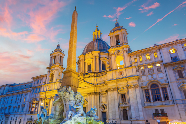 サン・ピエトロ大聖堂からテヴェレ川沿いを歩いて約15分、2世紀にハドリアヌス帝の霊廟として建設されたサンタンジェロ城が見えてきます。円形の独特な外観が目を引くこの城塞は、時代とともに要塞や牢獄、そして教皇の避難所としてさまざまな役割を果たしてきました。最大の見どころは屋上テラスからのパノラマビューです。サン・ピエトロ大聖堂の大クーポラやローマ市街、テヴェレ川を一望できる絶景スポットとなっています。入場料は大人14ユーロで、営業時間は9:00〜19:30です。城の手前に架かるサンタンジェロ橋には、ベルニーニ工房による10体の天使像が並び、写真撮影スポットとしても人気を集めています。【14:30】ナヴォーナ広場で噴水とバロック建築を堪能