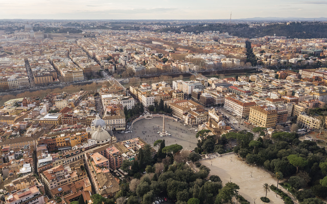 ボルゲーゼ公園の西側出口から坂を下ると、ローマの北の玄関口として栄えたポポロ広場に出ます。広場の南端に建つ双子教会が最大の見どころです。サンタ・マリア・デイ・ミラコリ教会とサンタ・マリア・イン・モンテサント教会はほぼ同じデザインで向かい合い、その間を3本の通りが放射状に延びる景観はローマを代表する美しい都市設計です。広場の中央にはエジプトから運ばれた高さ約24mのオベリスクがそびえています。時間に余裕があれば、広場の東側にあるピンチョの丘に登りましょう。テラスからはサン・ピエトロ大聖堂のクーポラを含むローマ市街の絶景パノラマが広がり、記念写真にぴったりです。見学はすべて無料です。【12:30】ローマの老舗カフェでイタリアンコーヒーを堪能