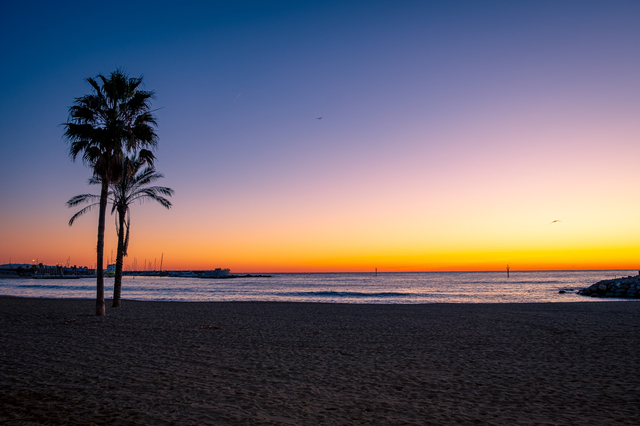 2日目の締めくくりは、バルセロネータビーチで地中海の夕景を楽しみましょう。メトロ4号線バルセロネータ駅から徒歩約5分とアクセス抜群で、バルセロナ中心部から最も気軽に訪れることができるビーチです。青い地中海が夕日に染まるグラデーションは息をのむ美しさで、砂浜に座ってゆったりと眺める時間は旅の忘れられない思い出になるはずです。ビーチ沿いにはシーフードレストランが立ち並んでおり、地中海を眺めながらの本場パエリアは格別。潮風を感じながらのディナーで、バルセロナ観光2日目を最高の形で締めくくりましょう。バルセロナ観光3日目のモデルコース|グエル公園とモンジュイックの絶景