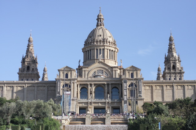グエル公園を見学したあとは、メトロでモンジュイックエリアへ移動し、カタルーニャ美術館(MNAC)を訪れましょう。モンジュイックの丘に建つ壮大な宮殿のような建物は、それ自体が圧倒的な存在感を放っています。館内には世界最大級のロマネスク美術コレクションが収蔵されており、ピレネー山脈の教会から移された12世紀のフレスコ画は必見です。入場料は一般12ユーロ。美術鑑賞の後は、建物前の大階段からバルセロナの街並みを見渡す眺望もお見逃しなく。スペイン広場からモンジュイックの丘へと続く壮大な景色が広がります。所要時間は約1.5〜2時間で、毎週土曜の15時以降は無料入場できるのもうれしいポイントです。【15:00】モンジュイック城から360度のパノラマビューを満喫