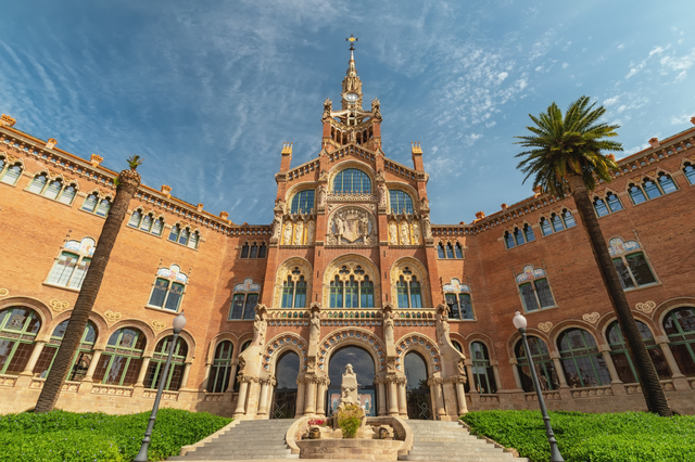 バルセロナ観光モデルコースの1日目は、サグラダ・ファミリアからスタートしましょう。1882年に着工し、2026年にはイエス・キリストの塔をはじめ主要な塔が完成を迎える予定で、まさに歴史的瞬間を目撃できるタイミングです。朝9時の入場枠は最も空いているため、ステンドグラスが朝日に照らされる幻想的な内部空間をゆったりと堪能できます。入場料は一般26ユーロ、塔のエレベーター付きは36ユーロ。塔に上るなら、街並みと海を見渡せる「生誕のファサード」側がおすすめです。所要時間は約1.5〜2時間。チケットは公式サイトで事前予約が必須で、2〜3週間前の購入が安心です。当日券は基本的に手に入らないので、早めに予約を済ませておきましょう。【11:30】サン・パウ病院でモデルニスモ建築の美に触れる