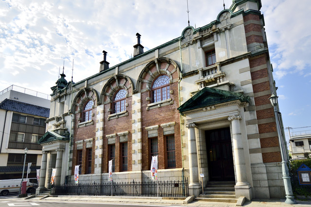 唐津観光モデルコースの最初に訪れたいのが、旧唐津銀行(辰野金吾記念館)です。東京駅の設計で知られる辰野金吾の監修のもと、弟子の田中実が設計した明治45年築の洋風建築で、佐賀県指定重要文化財に指定されています。赤レンガに白い御影石を組み合わせた「辰野式」と呼ばれるデザインが美しく、屋根に載る小塔やドームが異国情緒を感じさせます。1階には旧営業室や金庫室が残され、2階では辰野金吾に関する資料が展示されています。特に2階の貴賓室や美しいアーチ窓は必見です。入館無料で気軽に立ち寄れるのも魅力で、営業時間は9時から18時までです。唐津駅から徒歩約10分とアクセスも良好です。【10:45】曳山展示場で唐津くんちの迫力を体感する