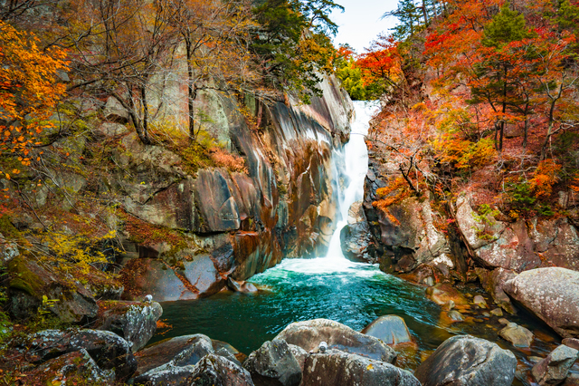 甲府観光モデルコースのハイライトは、国の特別名勝に指定された昇仙峡です。甲府駅南口バスターミナル4番乗り場からバスに乗り、昇仙峡口まで約30分(片道710円)、滝上まで約60分(片道1,090円)でアクセスできます。花崗岩の奇岩と清流が織りなす渓谷美は圧巻で、高さ約180mの巨岩「覚円峰」はまさに自然の芸術作品。遊歩道を歩いて渓谷を散策すれば、落差30mの「仙娥滝」の迫力ある姿にも出会えます。遊歩道の散策時間は約1.5〜2時間が目安です。滝上エリアにはお土産店や水晶の博物館もあり、休憩しながらゆっくり楽しめます。秋の紅葉シーズン(10月下旬〜11月中旬)は渓谷全体が赤や黄色に染まり、とくに美しい景観が広がります。なお、冬期(12月〜3月)はバスが昇仙峡口までの運行となるため、訪問時期にはご注意ください。甲府観光で外せないご当地グルメ&お土産