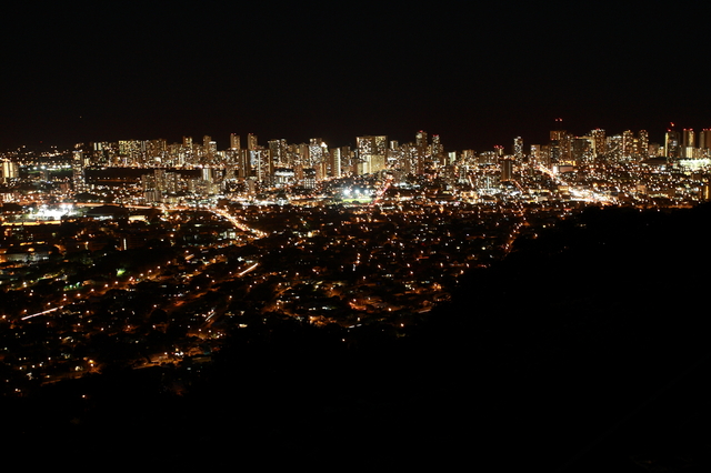 ハレイワから車で約10分のラニアケアビーチは、野生のウミガメ(ホヌ)に高確率で出会えるスポットとして有名です。砂浜でのんびり甲羅干しをするウミガメの姿は、ハワイならではの貴重な光景。ただし、ウミガメはハワイ州法で保護されているため、3メートル以上の距離を保つことが義務づけられています。触ったり近づきすぎたりしないよう、マナーを守って観察しましょう。ラニアケアビーチからさらに北へ足を延ばすと、冬季(11月〜2月)には10メートル級の大波が押し寄せるサンセットビーチがあります。世界中からトップサーファーが集まるダイナミックな波は、見ているだけでも迫力満点です。夏場は穏やかな波になるので、海水浴も楽しめます。【夕方】タンタラスの丘からホノルルの夜景を一望