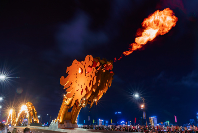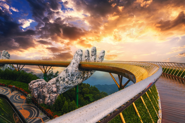 ダナン観光モデルコースの1日目の締めくくりは、ダナンのシンボルドラゴンブリッジです。全長666mの橋は龍がうねるようなデザインで、毎晩カラフルにライトアップされる夜景スポットとして人気を集めています。特に見逃せないのが、毎週金・土・日曜の21時から約15分間開催されるファイヤーショーとウォーターショーです。巨大な龍の頭から火や水が噴射される迫力満点のパフォーマンスは、ダナン観光のハイライトのひとつ。週末に合わせて1日目のスケジュールを組むのがおすすめです。ショーを間近で見たい場合は15〜40分前に場所を確保しましょう。橋の周辺にはナイトマーケットやカフェもあり、ショーの前後にぶらぶらと散策を楽しめます。ダナン観光2日目のモデルコース:天空のテーマパーク・バナヒルズを1日満喫