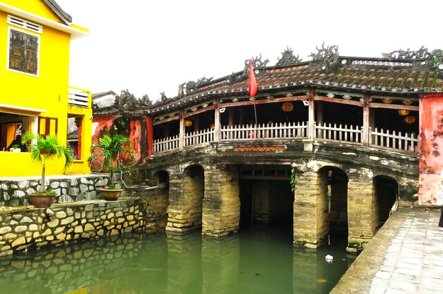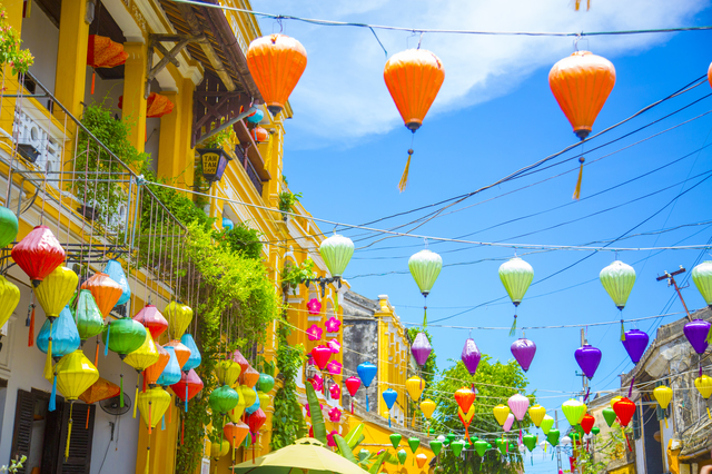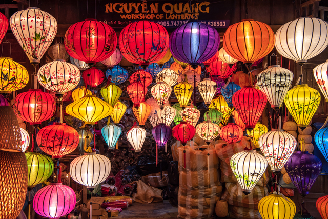 ランチの後は、黄色い壁の建物が並ぶノスタルジックなホイアン旧市街をじっくり散策しましょう。旧市街の観光チケットは120,000VND(約720円)で、22カ所の観光スポットのうち5カ所に入場できます。なかでも必見なのが、17世紀に日本人によって建造された屋根付きの橋日本橋(来遠橋)です。ベトナム紙幣のデザインにも採用されたホイアンのシンボルで、趣のある木造建築に歴史のロマンを感じられます。華やかな装飾が見事な中国式の寺院・福建会館も見逃せません。旧市街にはオーダーメイドの洋服店やランタンショップなど個性的なお店が並んでおり、お土産探しも楽しみのひとつ。石畳の通りをのんびり歩きながら、タイムスリップしたような気分を味わいましょう。【17:30】ランタンに彩られる幻想的な夜のホイアンを満喫