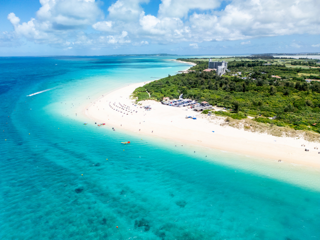 宮古島観光モデルコースの出発点は宮古空港です。空港到着後、ターミナル周辺にはレンタカー各社の送迎カウンターがあり、事前予約しておけばスムーズに手続きできます。レンタカーの料金目安は1日約3,000〜5,000円(車種・シーズンにより変動)で、軽自動車やコンパクトカーなら2名〜3名の旅行にぴったりです。繁忙期の7〜9月は予約が殺到するため、旅行が決まったら早めに押さえておきましょう。空港から宮古島市街地までは車で約12分、最初の目的地・与那覇前浜ビーチまでも約15分と非常にコンパクトなのが宮古島の魅力です。ナビの目的地を「与那覇前浜ビーチ」にセットしたら、さっそく宮古ブルーの世界へ出発しましょう。【13:00】与那覇前浜ビーチで東洋一の白砂を満喫