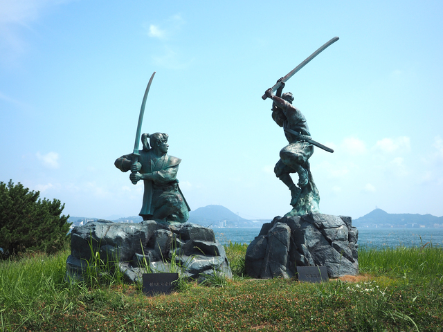 長府エリアの下関観光モデルコースでぜひ訪れたいのが、功山寺と長府毛利邸です。功山寺は鎌倉時代に建立された禅寺で、国宝に指定された仏殿は日本最古の禅宗様建築のひとつとして貴重な存在です。幕末には高杉晋作がわずか80名の同志とともに挙兵した地としても知られ、境内には騎馬像が建っています。仏殿の拝観料は大人500円。功山寺から徒歩数分の長府毛利邸は、明治時代に建てられた毛利家の邸宅で、手入れの行き届いた美しい日本庭園が見どころです。入館料は大人210円で、庭園を眺めながらの抹茶体験も人気があります。紅葉シーズンの11月中旬〜12月上旬は特に見事な景色が広がります。【15:00】巌流島で宮本武蔵と佐々木小次郎の決闘の地を訪れる