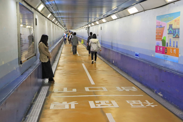 赤間神宮から徒歩約15分のみもすそ川公園を経由して、関門トンネル人道へ向かいましょう。みもすそ川公園は壇ノ浦の戦いと幕末の下関戦争の舞台となった場所で、源義経と平知盛の像や長州砲のレプリカが設置されています。そしてここから始まる関門トンネル人道は、全長780mの海底トンネルを徒歩約15分で渡れる全国でも珍しい体験スポットです。トンネルの中間地点には山口県と福岡県の県境ラインが引かれており、記念撮影の人気ポイントとなっています。通行料は無料、営業時間は6:00〜22:00で年中無休。門司側に渡ってから引き返しても良いですし、時間に余裕があれば門司港レトロを散策するのもおすすめです。【16:00】火の山公園から関門海峡の大パノラマを望む